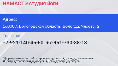 НАМАСТЭ, студия йоги по адресу 160009, Вологодская область, Вологда, Чехова, 2 в дальнейшем Организация, размещена в следующих категориях: