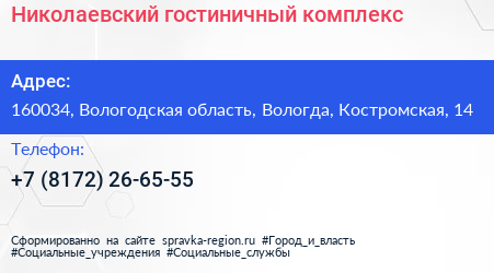 Николаевский, гостиничный комплекс по адресу 160034, Вологодская область, Вологда, Костромская, 14 в дальнейшем Организация, размещена в следующих категориях: