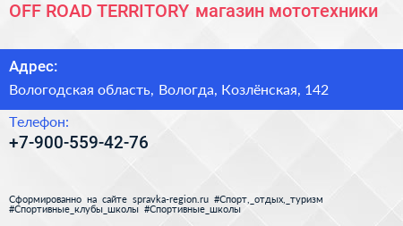 OFF ROAD TERRITORY, магазин мототехники по адресу Вологодская область, Вологда, Козлёнская, 142 в дальнейшем Организация, размещена в следующих категориях: