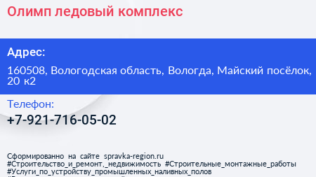 Олимп, ледовый комплекс по адресу 160508, Вологодская область, Вологда, Майский посёлок, 20 к2 в дальнейшем Организация, размещена в следующих категориях: