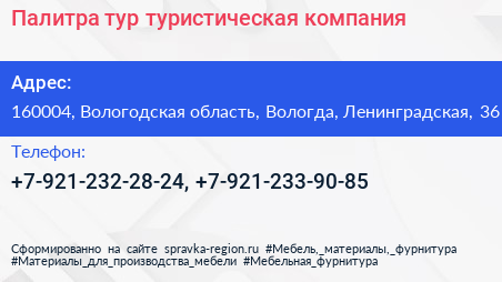 Палитра-тур, туристическая компания по адресу 160004, Вологодская область, Вологда, Ленинградская, 36 в дальнейшем Организация, размещена в следующих категориях: