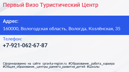 Первый Визо-Туристический Центр по адресу 160000, Вологодская область, Вологда, Козлёнская, 35 в дальнейшем Организация, размещена в следующих категориях: