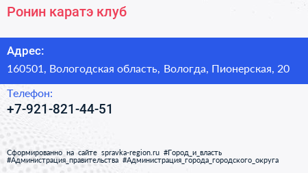 Ронин, каратэ-клуб по адресу 160501, Вологодская область, Вологда, Пионерская, 20 в дальнейшем Организация, размещена в следующих категориях: