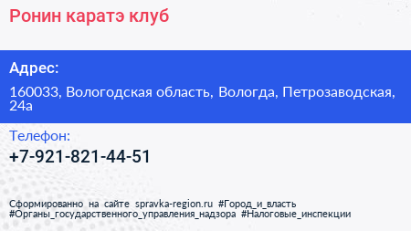 Ронин, каратэ-клуб по адресу 160033, Вологодская область, Вологда, Петрозаводская, 24а в дальнейшем Организация, размещена в следующих категориях: