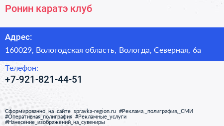 Ронин, каратэ-клуб по адресу 160029, Вологодская область, Вологда, Северная, 6а в дальнейшем Организация, размещена в следующих категориях: