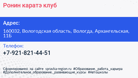 Ронин, каратэ-клуб по адресу 160032, Вологодская область, Вологда, Архангельская, 11Б в дальнейшем Организация, размещена в следующих категориях: