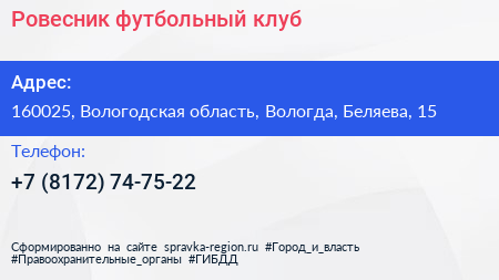 Ровесник, футбольный клуб по адресу 160025, Вологодская область, Вологда, Беляева, 15 в дальнейшем Организация, размещена в следующих категориях: