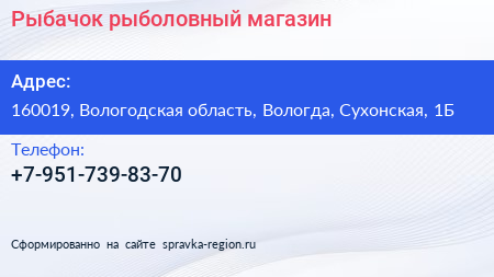 Рыбачок, рыболовный магазин по адресу 160019, Вологодская область, Вологда, Сухонская, 1Б в дальнейшем Организация, размещена в следующих категориях:
