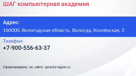 ШАГ, компьютерная академия по адресу 160000, Вологодская область, Вологда, Козлёнская, 3 в дальнейшем Организация, размещена в следующих категориях: