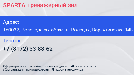SPARTA, тренажерный зал по адресу 160032, Вологодская область, Вологда, Воркутинская, 14Б в дальнейшем Организация, размещена в следующих категориях: