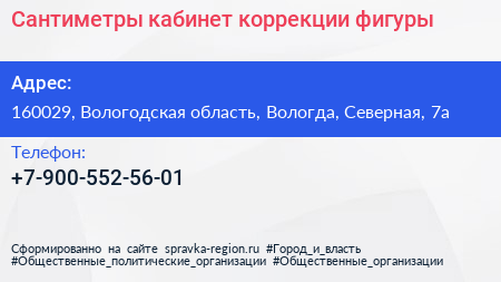Сантиметры, кабинет коррекции фигуры по адресу 160029, Вологодская область, Вологда, Северная, 7а в дальнейшем Организация, размещена в следующих категориях: