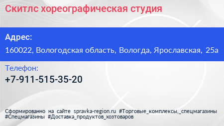 Скитлс, хореографическая студия по адресу 160022, Вологодская область, Вологда, Ярославская, 25а в дальнейшем Организация, размещена в следующих категориях: