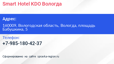 Smart Hotel KDO Вологда по адресу 160009, Вологодская область, Вологда, площадь Бабушкина, 5 в дальнейшем Организация, размещена в следующих категориях:
