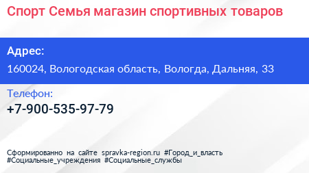 Спорт Семья, магазин спортивных товаров по адресу 160024, Вологодская область, Вологда, Дальняя, 33 в дальнейшем Организация, размещена в следующих категориях: