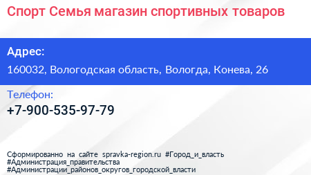 Спорт Семья, магазин спортивных товаров по адресу 160032, Вологодская область, Вологда, Конева, 26 в дальнейшем Организация, размещена в следующих категориях: