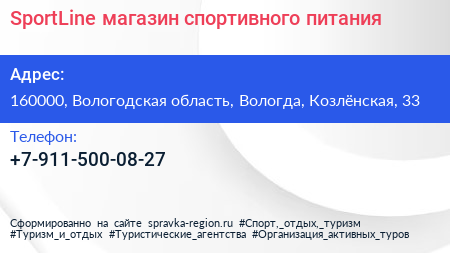 SportLine, магазин спортивного питания по адресу 160000, Вологодская область, Вологда, Козлёнская, 33 в дальнейшем Организация, размещена в следующих категориях:
