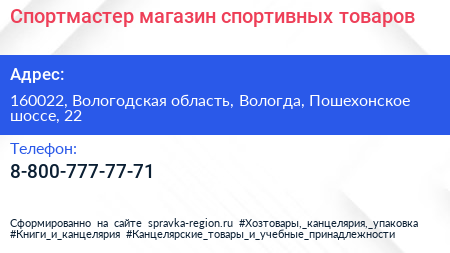 Спортмастер, магазин спортивных товаров по адресу 160022, Вологодская область, Вологда, Пошехонское шоссе, 22 в дальнейшем Организация, размещена в следующих категориях: