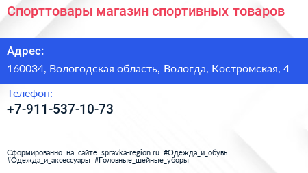 Спорттовары, магазин спортивных товаров по адресу 160034, Вологодская область, Вологда, Костромская, 4 в дальнейшем Организация, размещена в следующих категориях: