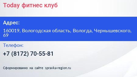 Today, фитнес-клуб по адресу 160019, Вологодская область, Вологда, Чернышевского, 69 в дальнейшем Организация, размещена в следующих категориях: