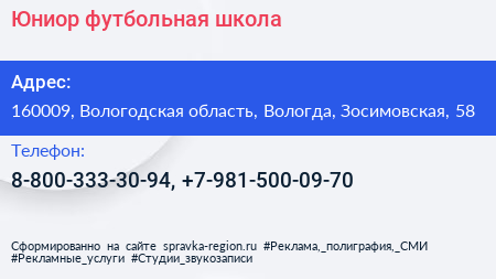 Юниор, футбольная школа по адресу 160009, Вологодская область, Вологда, Зосимовская, 58 в дальнейшем Организация, размещена в следующих категориях: