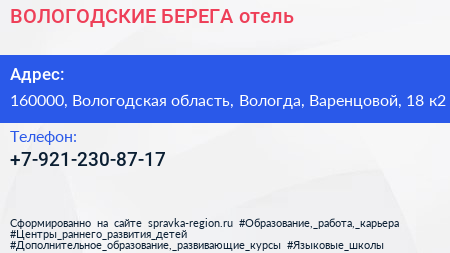 ВОЛОГОДСКИЕ БЕРЕГА, отель по адресу 160000, Вологодская область, Вологда, Варенцовой, 18 к2 в дальнейшем Организация, размещена в следующих категориях: