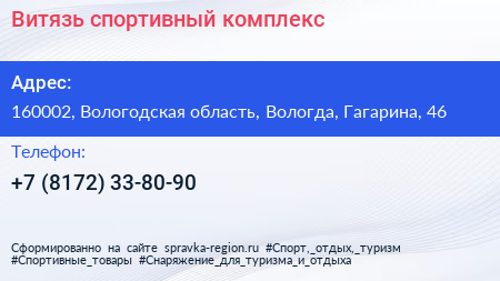Витязь, спортивный комплекс по адресу 160002, Вологодская область, Вологда, Гагарина, 46 в дальнейшем Организация, размещена в следующих категориях: