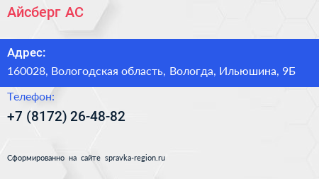 Айсберг АС по адресу 160028, Вологодская область, Вологда, Ильюшина, 9Б в дальнейшем Организация, размещена в следующих категориях:
