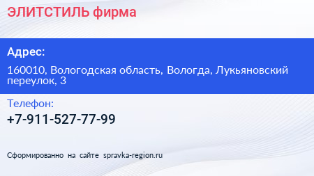 ЭЛИТСТИЛЬ, фирма по адресу 160010, Вологодская область, Вологда, Лукьяновский переулок, 3 в дальнейшем Организация, размещена в следующих категориях: