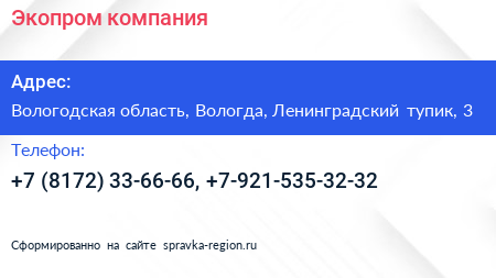 Экопром, компания по адресу Вологодская область, Вологда, Ленинградский тупик, 3 в дальнейшем Организация, размещена в следующих категориях: