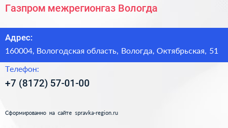 Газпром межрегионгаз Вологда по адресу 160004, Вологодская область, Вологда, Октябрьская, 51 в дальнейшем Организация, размещена в следующих категориях: