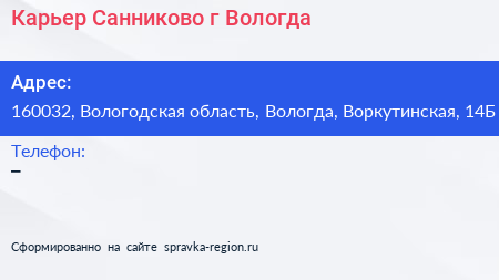 Карьер Санниково, г. Вологда по адресу 160032, Вологодская область, Вологда, Воркутинская, 14Б в дальнейшем Организация, размещена в следующих категориях: