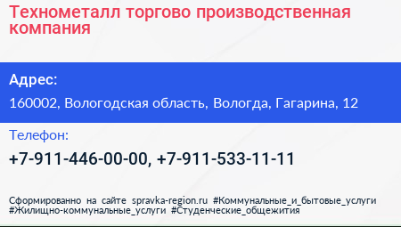 Технометалл, торгово-производственная компания по адресу 160002, Вологодская область, Вологда, Гагарина, 12 в дальнейшем Организация, размещена в следующих категориях: