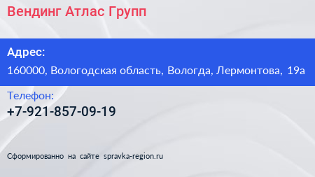 Вендинг Атлас Групп по адресу 160000, Вологодская область, Вологда, Лермонтова, 19а в дальнейшем Организация, размещена в следующих категориях: