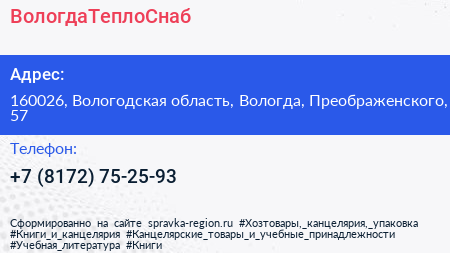 ВологдаТеплоСнаб по адресу 160026, Вологодская область, Вологда, Преображенского, 57 в дальнейшем Организация, размещена в следующих категориях: