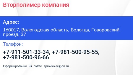 Вторполимер, компания по адресу 160017, Вологодская область, Вологда, Говоровский проезд, 37 в дальнейшем Организация, размещена в следующих категориях: