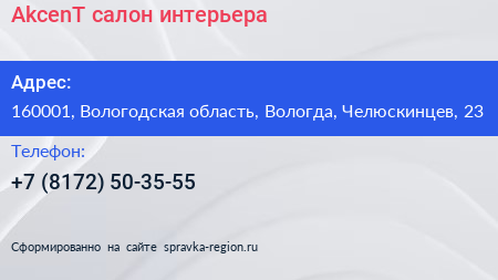 AkcenT, салон интерьера по адресу 160001, Вологодская область, Вологда, Челюскинцев, 23 в дальнейшем Организация, размещена в следующих категориях: