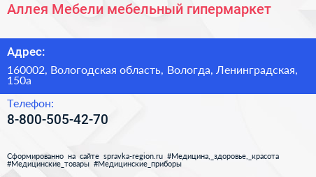 Аллея Мебели, мебельный гипермаркет по адресу 160002, Вологодская область, Вологда, Ленинградская, 150а в дальнейшем Организация, размещена в следующих категориях: