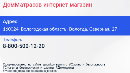 ДомМатрасов, интернет-магазин по адресу 160024, Вологодская область, Вологда, Северная, 27 в дальнейшем Организация, размещена в следующих категориях: