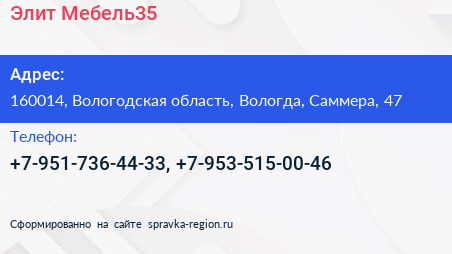 Элит-Мебель35 по адресу 160014, Вологодская область, Вологда, Саммера, 47 в дальнейшем Организация, размещена в следующих категориях: