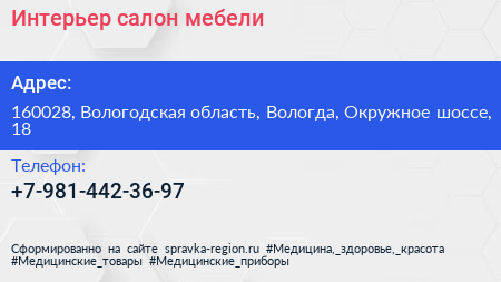 Интерьер, салон мебели по адресу 160028, Вологодская область, Вологда, Окружное шоссе, 18 в дальнейшем Организация, размещена в следующих категориях: