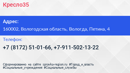 Кресло35 по адресу 160002, Вологодская область, Вологда, Петина, 4 в дальнейшем Организация, размещена в следующих категориях: