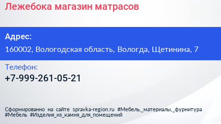 Лежебока, магазин матрасов по адресу 160002, Вологодская область, Вологда, Щетинина, 7 в дальнейшем Организация, размещена в следующих категориях: