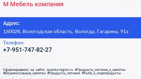 М-Мебель, компания по адресу 160028, Вологодская область, Вологда, Гагарина, 91а в дальнейшем Организация, размещена в следующих категориях: