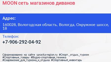 MOON, сеть магазинов диванов по адресу 160028, Вологодская область, Вологда, Окружное шоссе, 18 в дальнейшем Организация, размещена в следующих категориях: