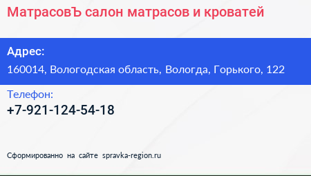 МатрасовЪ, салон матрасов и кроватей по адресу 160014, Вологодская область, Вологда, Горького, 122 в дальнейшем Организация, размещена в следующих категориях: