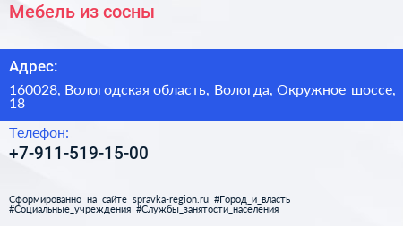 Мебель из сосны по адресу 160028, Вологодская область, Вологда, Окружное шоссе, 18 в дальнейшем Организация, размещена в следующих категориях: