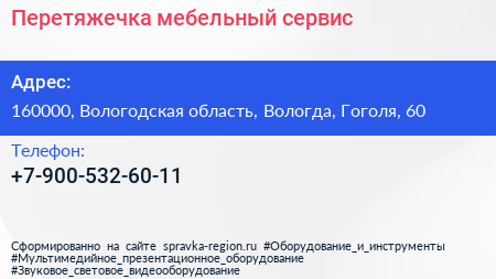 Перетяжечка, мебельный сервис по адресу 160000, Вологодская область, Вологда, Гоголя, 60 в дальнейшем Организация, размещена в следующих категориях: