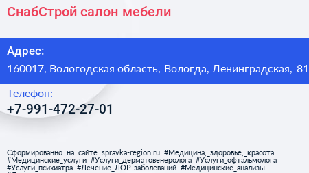СнабСтрой, салон мебели по адресу 160017, Вологодская область, Вологда, Ленинградская, 81 в дальнейшем Организация, размещена в следующих категориях: