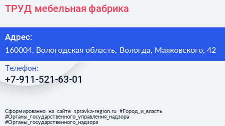 ТРУД, мебельная фабрика по адресу 160004, Вологодская область, Вологда, Маяковского, 42 в дальнейшем Организация, размещена в следующих категориях: