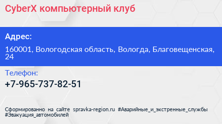 CyberX, компьютерный клуб по адресу 160001, Вологодская область, Вологда, Благовещенская, 24 в дальнейшем Организация, размещена в следующих категориях: